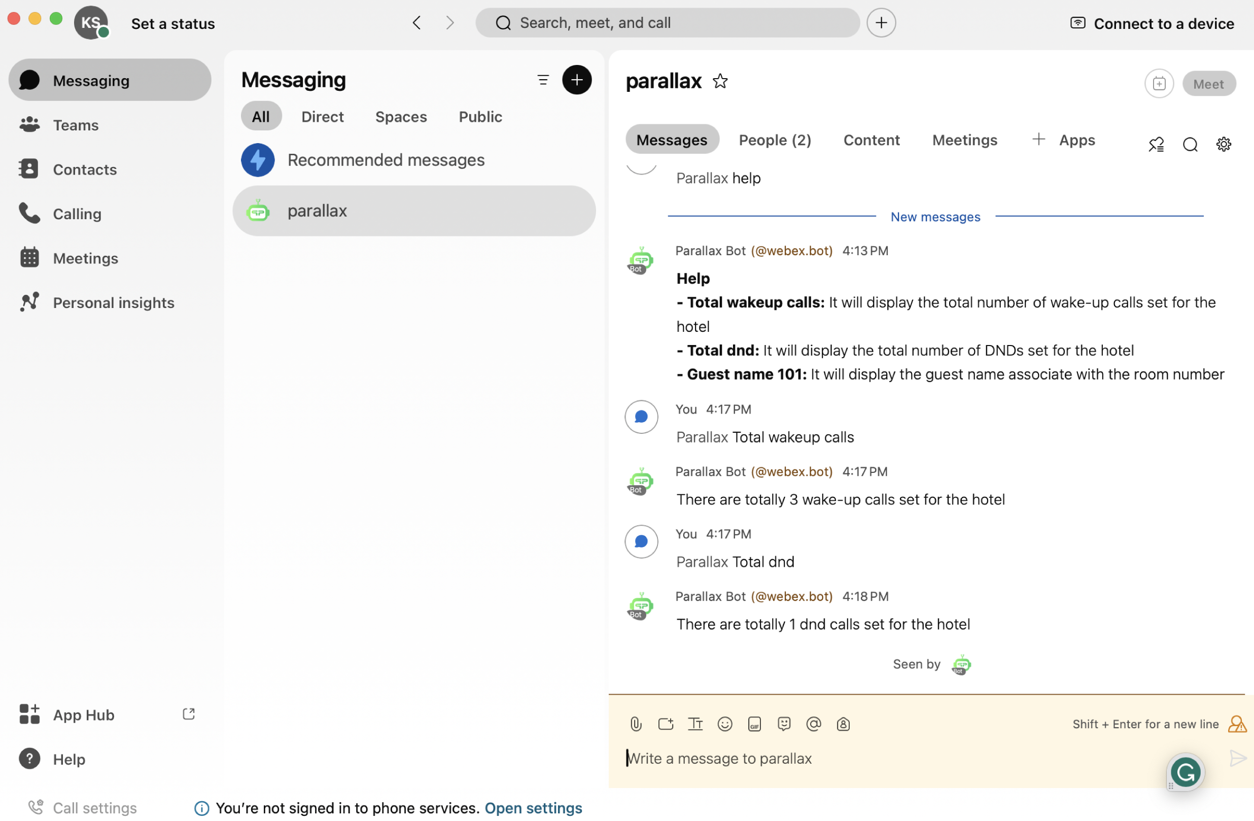 With Parallax Bot for Webex, Hotel Front Desk Agents and Call Center Operators are no longer required to manually log into separate systems to fulfill guest requests. You can now enter commands to set wake up calls, service requests, and get housekeeping room status updates by simply messaging Parallax Bot.